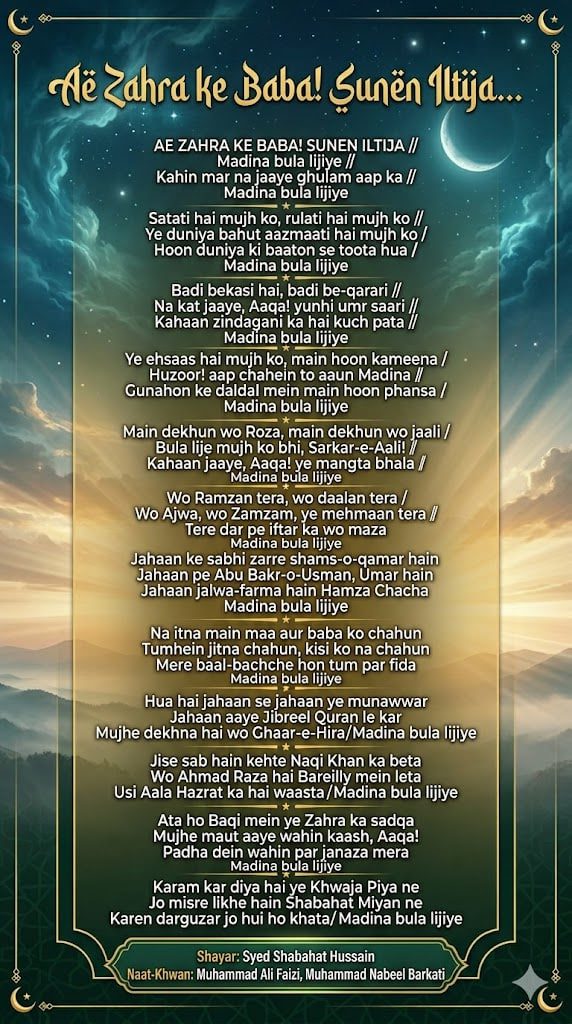 Ae Zahra Ke Baba Sunen Iltija lyrics is a deeply emotional naat expressing the pain of separation from Madina and the heartfelt desire to visit the blessed city. This kalam is full of longing, tears, and love for the Prophet ﷺ.This touching naat, known as Ae Zahra Ke Baba Sunen Iltija lyrics, is written by Syed Shabahat Hussain and recited by Muhammad Ali Faizi and Muhammad Nabeel Barkati.