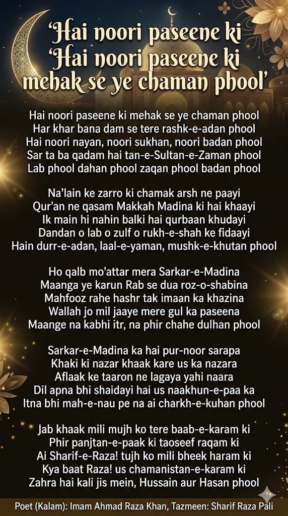 If you are searching for Lab Phool Dahan Phool Zaqan Phool Badan Phool Lyrics, this legendary naat by Imam Ahmad Raza Khan beautifully describes the noor and جمال of Sarkar ﷺ. Lab Phool Dahan Phool Zaqan Phool Badan Phool Lyrics is one of the most powerful kalaam expressing deep love and devotion towards the Prophet ﷺ.
