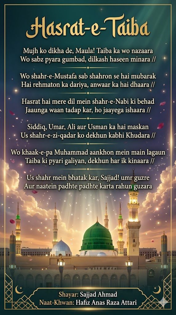 This emotional kalam, known as Mujh Ko Dikha De Maula Taiba Ka Wo Nazara lyrics, is written by Sajjad Ahmad and recited by Hafiz Anas Raza Attari.
