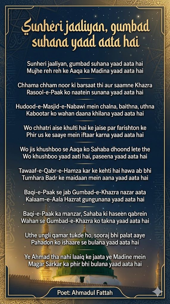 If you are looking for Sunheri Jaaliyan Gumbad Suhana Yaad Aata Hai Lyrics, this beautiful naat expresses deep love and longing for Madina and Gumbad-e-Khazra. Sunheri Jaaliyan Gumbad Suhana Yaad Aata Hai Lyrics by Ahmadul Fattah is a heart-touching kalam that reminds every عاشقِ رسول ﷺ of the spiritual beauty of Masjid-e-Nabawi.